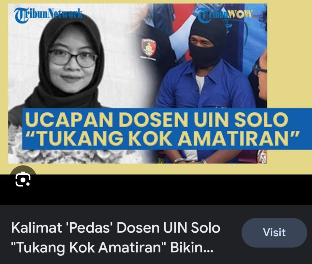 (Ada kemungkinan) Inilah yang terjadi pada tukang yang bertugas merenov rumah dosen UIN tersebut. Entah ada pekerjaannya yang tidak sesuai harapan, Bu Dosen nyeletuk “tukang kok amatiran”. Perkataan ini sekilas terdengar biasa saja. Namun nyatanya, bisa menyulut emosi pak tukang sehingga muncul keinginan menghabisi Bu Dosen tadi. Dan keinginan itu diwujudken dengan melakuken pembunuhan yang mengakibatken tewasnya Bu Dosen.